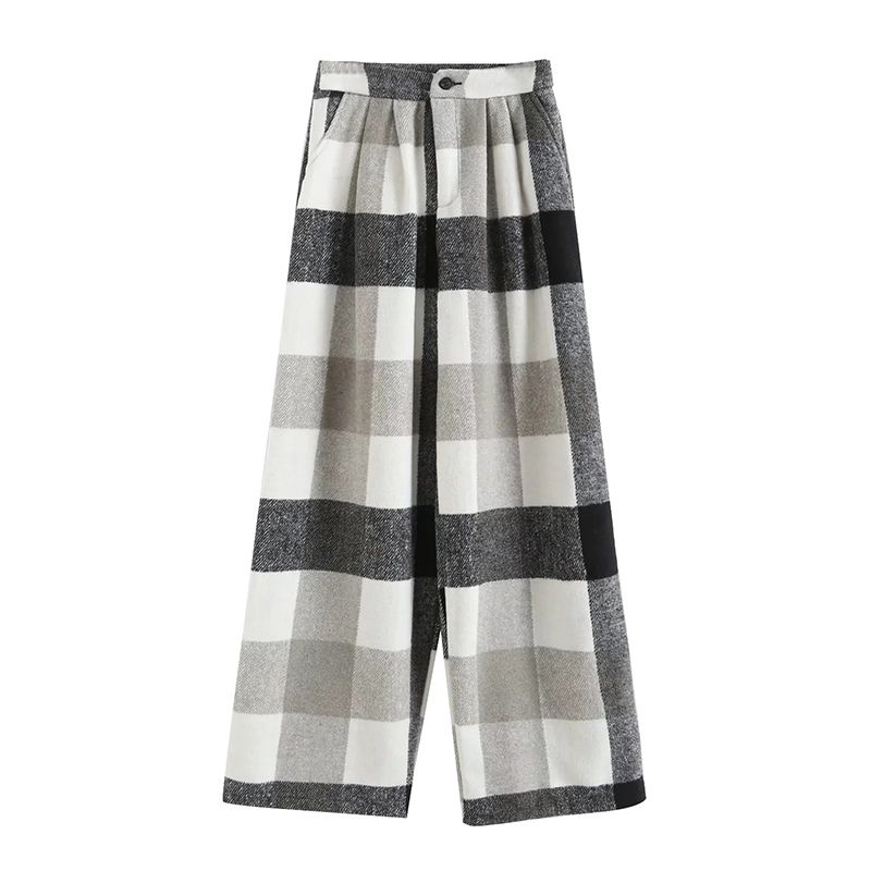 Woolen Plaid Wide leg Pants For Women Pockets Loose Casual Women's Pant 2021 Autumn Winter Fashion Vintage Trousers Female